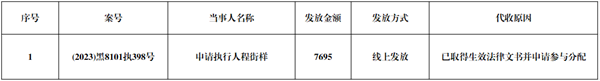 为切实巩固执行案款清理成果,强化执行案款管理,依法维护当事人合法权益,确保执行案款发放规范有序、及时高效,拓宽司法公开广度和深度,提升司法公信力。依据《黑龙江省高级人民法院向案外人发放执行案款公示制度》的规定,现将向案外人发放执行案款信息予以公示,公示期:七天。